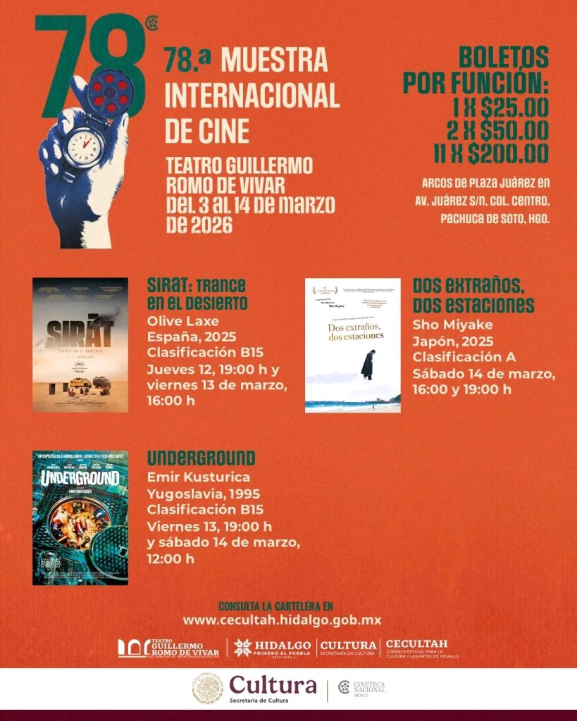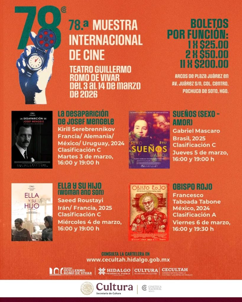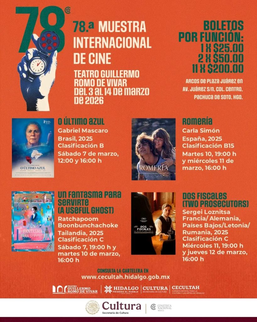 El Consejo Estatal para la Cultura y las Artes de Hidalgo (Cecultah) trae la 78 Muestra Internacional de Cine de la Cineteca Nacional, a la ciudad de Pachuca.